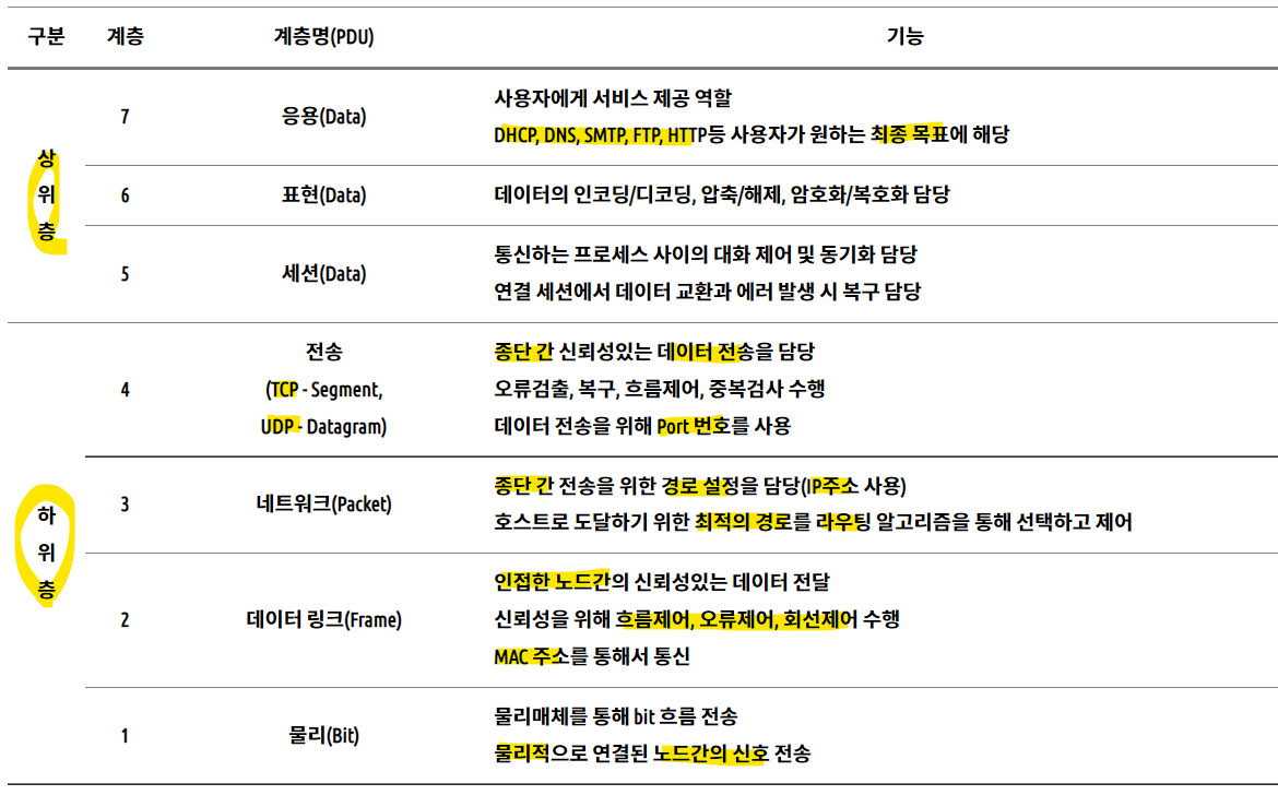 - 네트워크에서 통신이 일어나는 과정을 7단계로 나눈 것을 말한다.