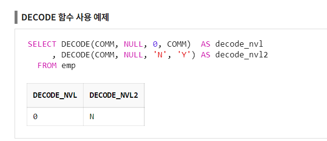 예) DECODE(컬럼, 조건1, 결과1, 조건2, 결과2, 조건3, 결과3..........)